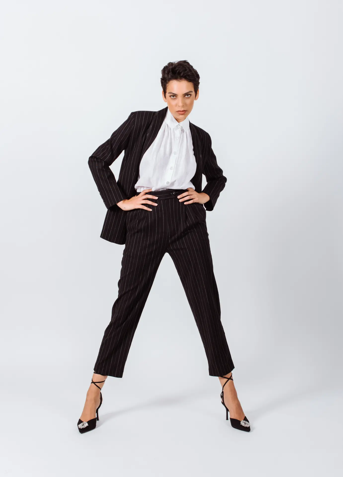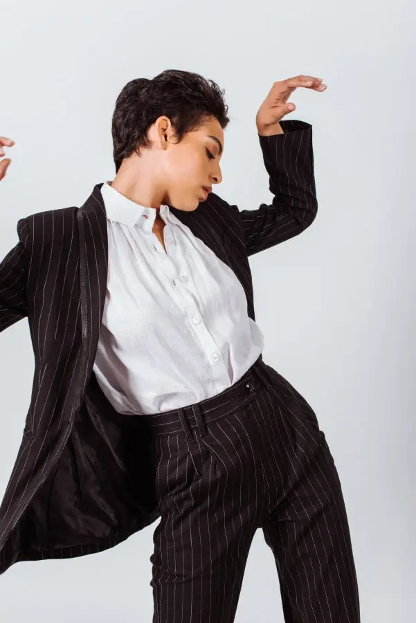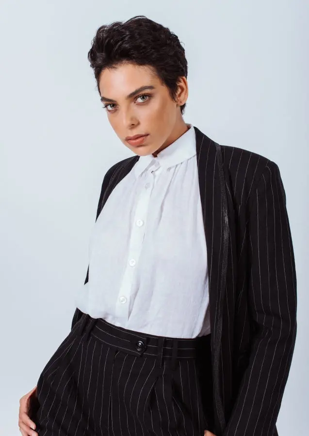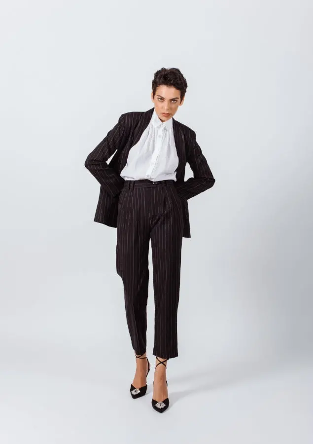 Create a borrowed-from-the-boys ensemble with this pair of black pants from Le Reussi. Crafted from linen blend with white stripes, they start at a high-rise waist and fall into a slim-straight leg. Take inspiration from the FW22-23, letting yours anchor an ’80s-inspired outfit.