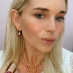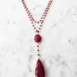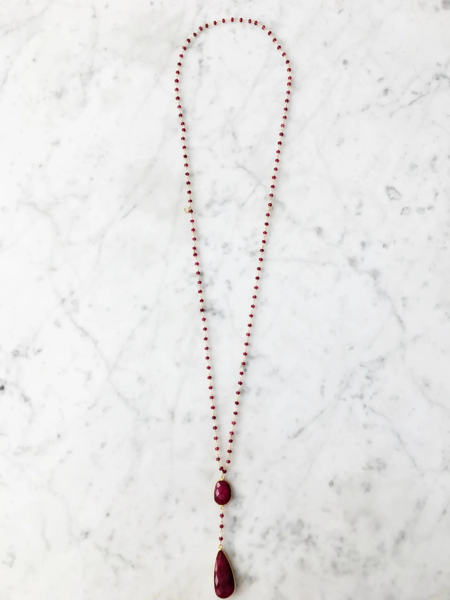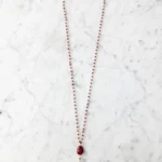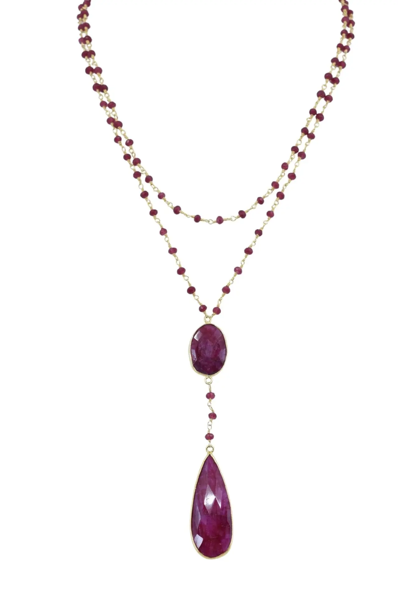A 16″ gold and semi-precious ruby beaded chain necklace with a second 17″ gold and semi-precious ruby beaded chain necklace with a round semi-precious ruby stone set in a 14k gold vermeil bezel, cascading down to a teardrop-shaped semi-precious ruby stone pendant set in an 14k gold vermeil bezel.