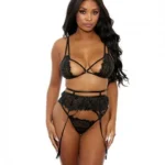 Tempt and tease in this eyelash lace bra set featuring sheer cups with cut-out panels, double adjustable spaghetti straps, a hook and eye back closure, a high-waisted lace garter belt with a strappy waistband and multi-strapped garter straps, and a matching G-string. Large. Bust 39 inches. Waist 31 inches. Hips 41 inches.