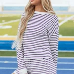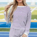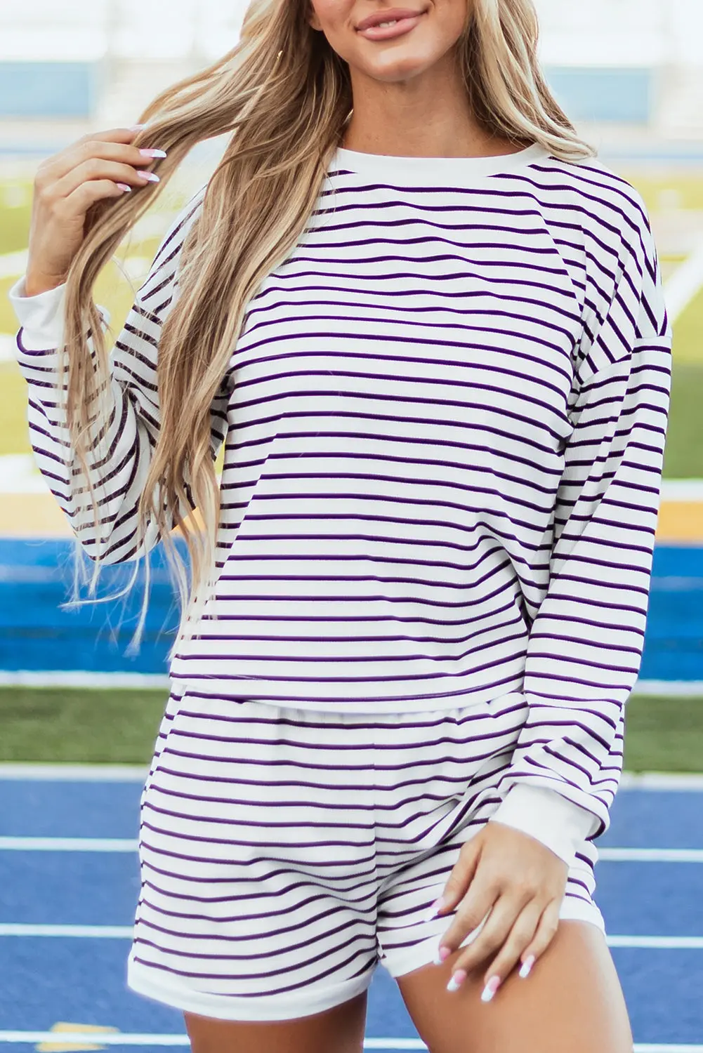 This adorable set adds flair and flexibility to any outfit. Upgrade your fashion game with fashionable stripes. The unique fabric adds dimension and catches the eye. Plus, the high-rise shorts have convenient pockets on the side.