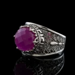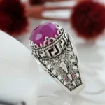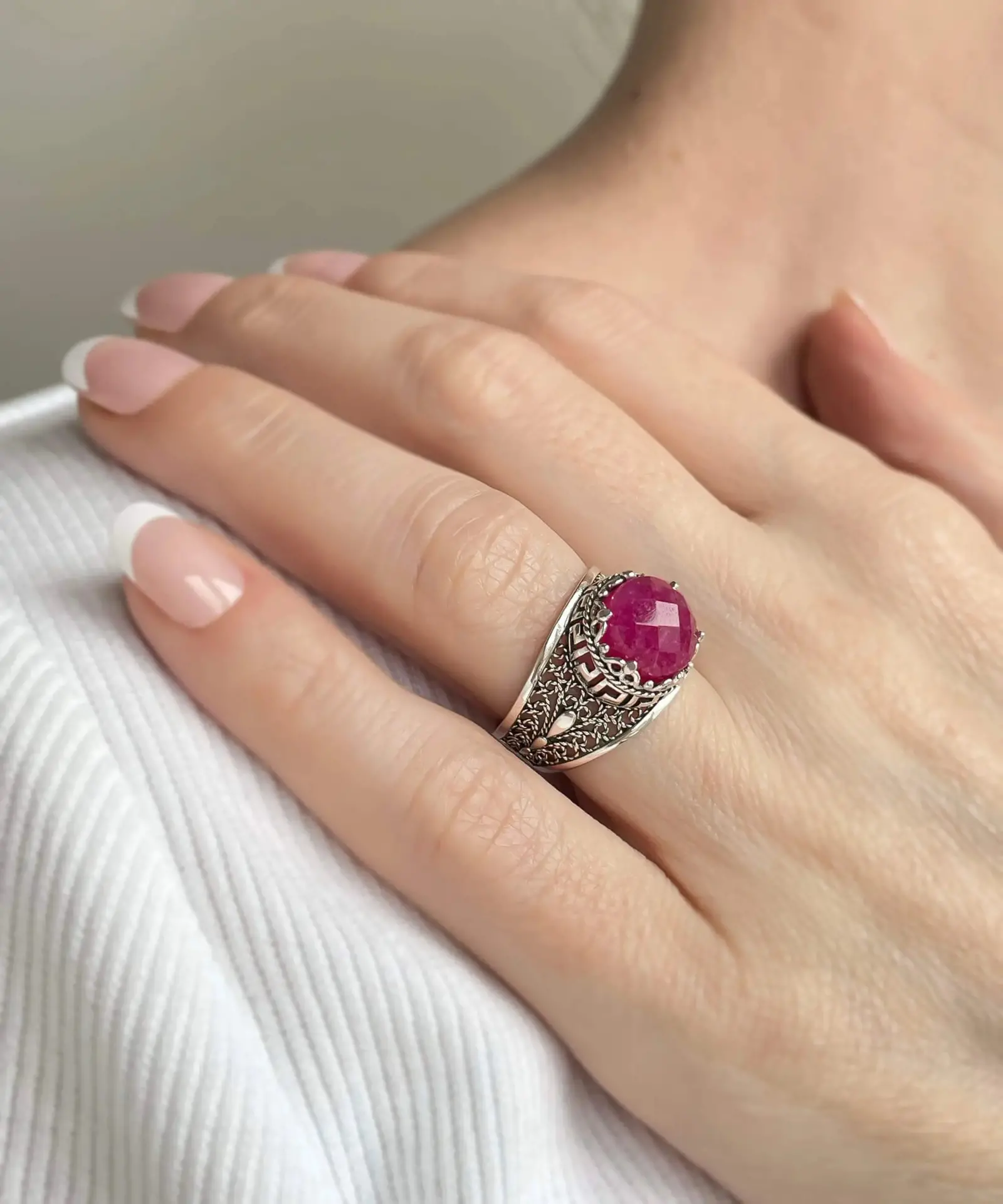 Looking for a unique and eye-catching ring that can elevate any outfit? Look no further than this stunning 925 sterling silver filigree art Greek key cocktail ring with a natural opaque dyed ruby corundum gemstone. The ring face is 0.47 inches (12 mm) and the ruby corundum gemstone is 10 mm long and faceted to round-cut to enhance its beauty.