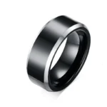 A durable, modern mens Tungsten carbide ring with a soft black finish set off with almost reflective silver edging, perfect for daily wear and an excellent sleek wedding band choice.