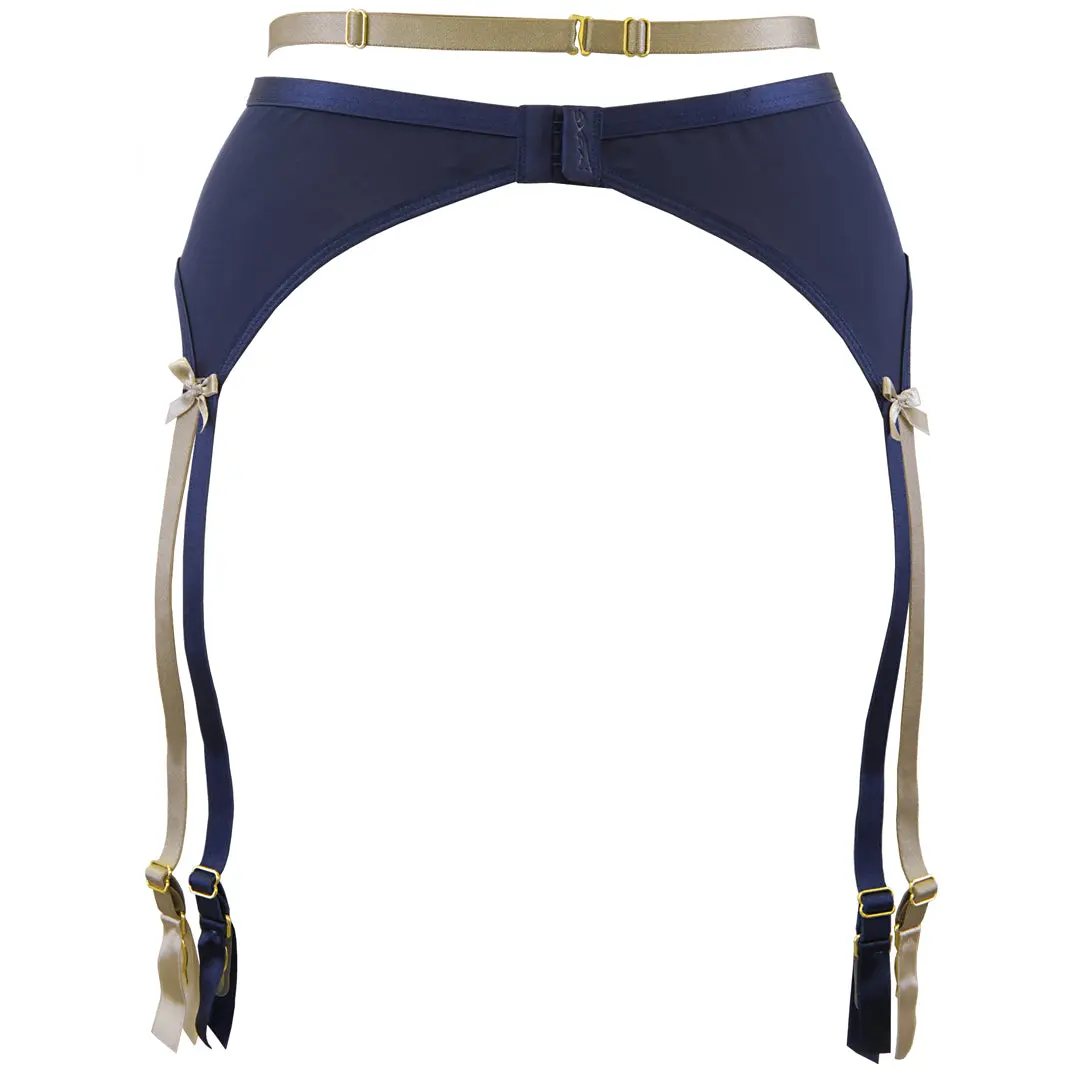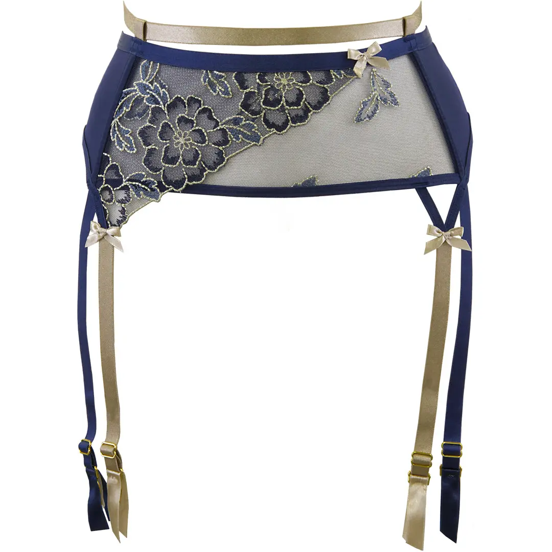 Sheer mesh garter belt by Axami Lingerie. Charming, richly decorated and perfectly modeled garter belt that emphasizes the seductive advantages. Two-tone, gold and navy blue, adjustable suspender straps with gold buckles. The belt with a champagne satin ribbon that accentuates the waist is a magical combination of great form and rich ornament.