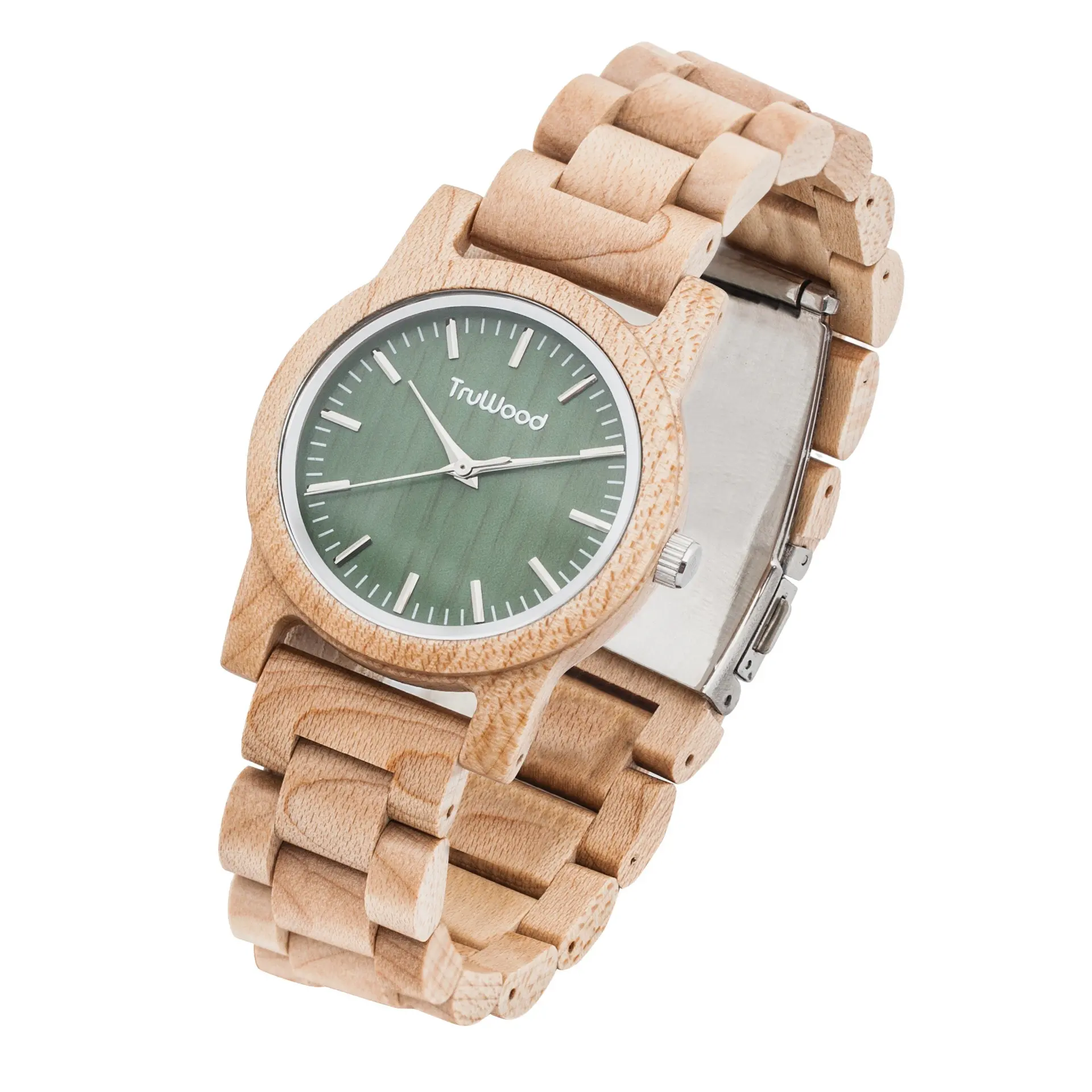 Everyday elegance has never been so accurate a description for any timepiece. The TruWood Stark is handcrafted by expert watchmakers, built on excellence and never cutting corners. The light maple wood case is polished to ensure a uniform grain and specially cured for water resistance in a stunning slim profile. Silver hands stand out on the Stark’s signature green dial housed in a sapphire coated crystal glass, providing the perfect bridge between bold and simplicity. The lightweight wooden links complete the Stark as your most comfortable watch ever.