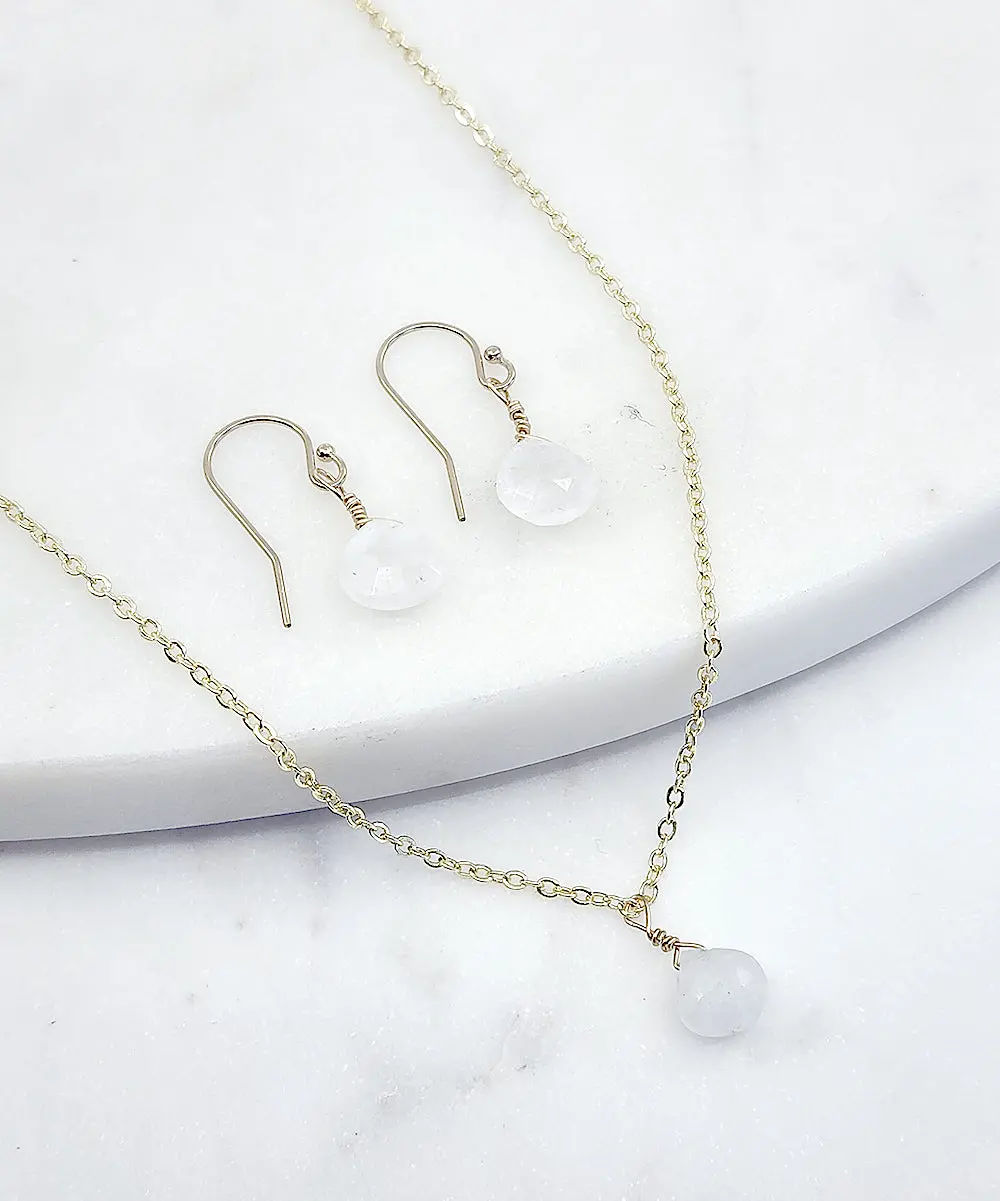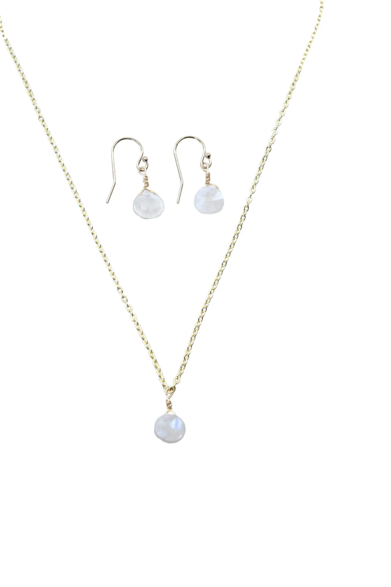 A dainty moonstone hand wrapped to create a simple but sweet necklace and earring set. Stones are wrapped in 14k gold wire. The necklace is a vermeil chain with a lobster clasp.